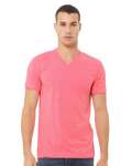 Bella+Canvas Unisex 4.2 Ounce Jersey Short Sleeve V-Neck T-Shirt. Sideseamed. Retail fit. Unisex sizing. Shoulder taping. Tear Away Label. Athletic Heather b 90/10% Airlume combed and ringspun cotton/poly All other Heather CVC/Blend colors 52/48% Airlume combed and ringspun cotton/poly.