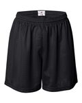 Badger Ladies Mesh/Tricot 5 Inseam Short. 100% Polyester, 70 denier mesh with solid tricot liner. Athletic cut, Superior fit. Covered elastic waistband and drawcord. Five-inch inseam.